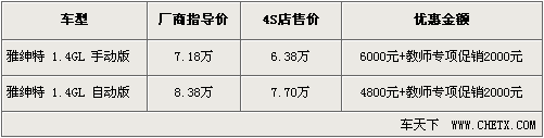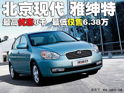 据4S店销售人员介绍:目前09款雅绅特只有1.4手动及自动两款车型在售,分别优惠4千-6千元,另外北京现代推出教师节补贴活动,凡在9月15日之前购车的教师用户,还可享受教师专项促销减2千元,同时购车用户还能得到商家随车赠送的部分车内装饰。