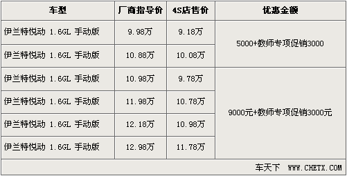 据4S店销售人员介绍:部分经销商处新伊兰特悦动全系最高可以优惠到9000元,1.6L车型可以优惠5000元现金,另外北京现代推出教师节补贴活动,凡在9月15日之前购车的教师用户,还可享受教师专项促销减2千元,目前销售的现车比较充足。
