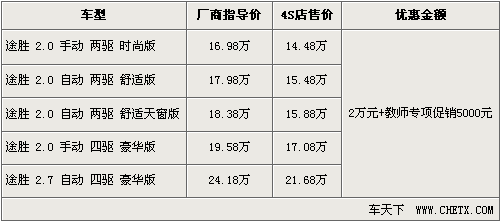 北京现代途胜SUV是国内销售较早的SUV车型,上市之初销量一直在SUV市场一枝独秀,但随着同级车的竞争加大,途胜也面临更新换代,预计新款将在明年推出。据网上车市价格监测系统显示:目前北京现代推出教师活动,购买途胜的用户最高可享受到2.2万元的现金优惠。具体行情如下: