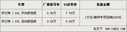 据北京现代4S店销售人员介绍,目前在售的伊兰特分为手动舒适、自动舒适2款低配车型,但是天窗和真皮座椅可以加钱选配,目前低配的1.6L手动舒适型还是维持原来的1万元优惠,降价后售价仍为7.98万,自动舒适降价后为8.88万,另外北京现代推出教师节补贴活动,凡在9月15日之前购车的教师用户,还可享受教师专项促销减2千元。