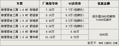 目前普通版新爱丽舍的部分车型采用了包牌销售的方式,其中包括标准手动型、新爱丽舍标准自动型、新爱丽舍舒适手动型、新爱丽舍舒适自动型。只要购买其中任意一款车型。而另外两款1.6豪华版并未在此次活动范围内,但购车可以优惠现金4000元。