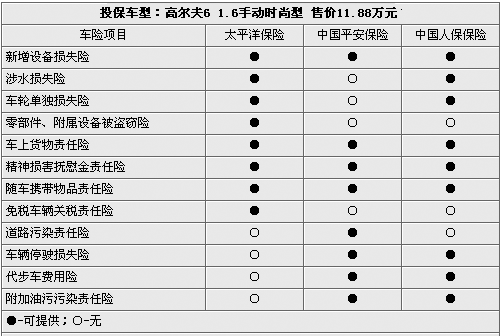 在太平洋、平安、中保等三家保险公司的保险项目里,机动车交通事故责任强制保险是一项强制保险项目,并且价格统一为950元(报价 参数 图片 论坛)整。除此之外,三家保险公司的车险项目基本保持一致,但相应的费率存在一定的浮动,其中中国平安保险的报价最低,太平洋保险的报价最高。另外,在机动车第三者责任险中,消费者除了可以选取5万保险额外,还可以选择10万、15万、20万元保额等。而在车身油漆单独损伤险(常说的划痕险)方面,消费者也可以选取更高的保额如5000元、10000元不等。由于新车在第一年里属于汽车厂商的保修范围之内,所以自燃损失险可以不上。值得一提的是“不计免赔”这个险种,购买这个险种的最终的是消费者出险后保险公司可以百分之百的赔偿,反之则只能按照比例部分赔偿。