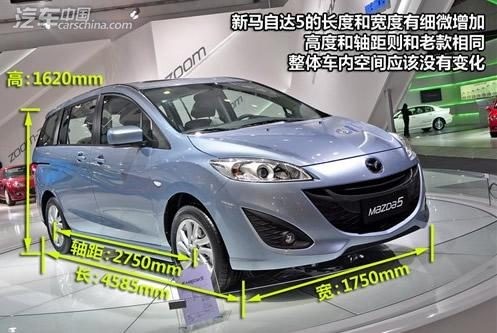 2011款马自达5共推出一个排量三款车型,在外观设计上并没有明显的变化,只是车身尺寸做了小调改。新马自达5的车身尺寸达到4585mm/1750mm/1620mm,比老款车型要长20mm,宽5mm。轴距和老款相同均为2750mm。