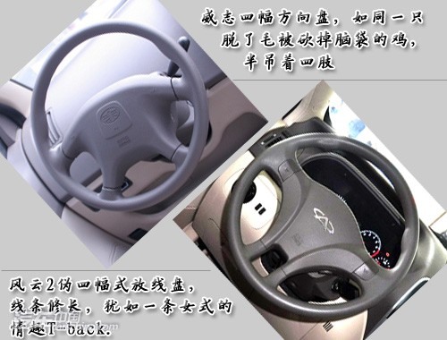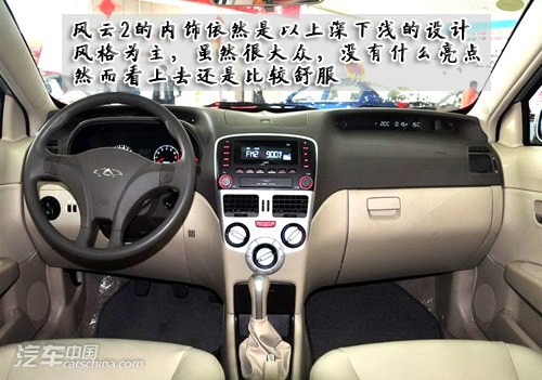 而风云二的内饰设计,则车外观前脸保持着高度的统一,整个仪表台也加入了鲸鱼尾一样的仿生学设计,正副驾驶位使用了相同的设计,只不过在副驾驶的正前方,少一个仪表盘而已;不得不承认,这样的设计的确匠心独具,只不过有多少人能认可这样的设计,那还得看市场的反应了;而伪四幅式方向盘,没有采用A3的饱满式设计,看上去很修长,骨干,造型上有点新君威(报价 参数 图片 论坛)的影子,只不过少了镀铬装饰的风云2,似乎有点像女人穿的情趣T-back。