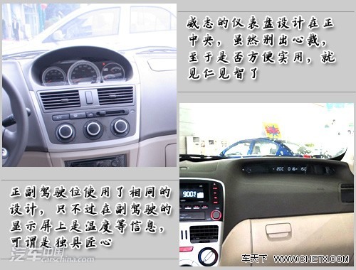 威志的内饰上,有一些别出心裁的另类设计,只不过有的不美观,而有的不实用——比如说伪四幅式方向盘,不过那四“肢”全部都是向下的趋势,如同一只洗干净后,被砍掉脑袋的鸡,耷拉着两个翅膀和两只脚;而仪表盘采用居中的设计,或许这样对于驾驶位来说,视线效果会更好、更宽阔;对内饰的整体结构而言,也更对称,然而这对于那些开惯了传统车型的老司机来说,却多少并不是十分习惯。