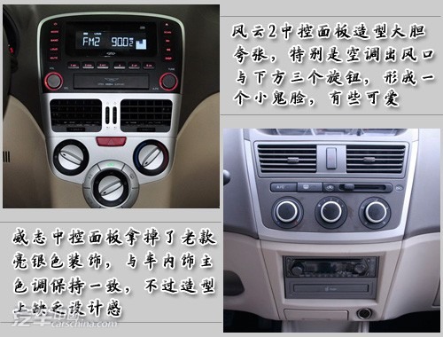 来到车尾,威志的设计比较平顺、自然,而且干净利落,尾灯造型平庸,但红白组合看上去倒也醒目和漂亮;相比之下,风云2的尾箱衔接得并不十分平顺,略感突兀和紧促,好比一两厢轿车拖了一个外接的斗,而晶钻式尾灯看上去很相当时尚,尾部复杂的线条勾勒出一个敦实的尾部,增强驾驶者的安全感。