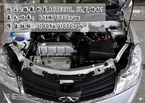 风云2搭载的是奇瑞自主的ACTECO1.5L发动机,去年获得过“2008年度十佳发动机”称号。这款发动机之前也装备在旗云和A5上,最大功率为80KW/6000rpm,最大扭矩为140Nm/3000rpm,动力数据一般。由于对缸体、燃烧室结构和进排气机构的多次优化以及减磨阻工艺,在节油方面的表现有所提升;与发动机搭配的是5速手动变速箱,这款变速箱的技术比较成熟,圆头的造型也很有手感,表现不错。
