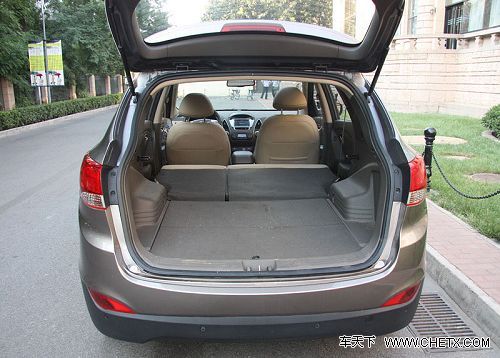 空间方面:ix35的内部设计相对于繁杂的外观显得平淡了很多,避免了过多的花哨给驾驶员一个舒适的驾驶空间。北京现代ix35(报价 参数 图片 论坛)车身尺寸分别为4420×1820×1660mm,在同级车中属于中等尺寸,尽管其轴距只有2640mm,但是显然ix35的后排空间是那些轴距相当的紧凑车型无法比拟的,车后备箱空间达到465升,如果将第二排放到,空间可徒增至1436升。虽然不可以和途观相比,但是也能满足人们日常的生活需要。况且ix35在主打的“舒适牌”上做得很到位,包裹的真皮坐椅和安静的驾驶环境还是非常值得称道的。