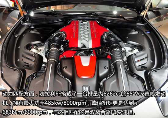 动力匹配方面,法拉利FF搭载了一台排量为6262cc的65°V12直喷发动机,拥有最大功率485kw/8000rpm,峰值扭矩更是达到了683N·m/6000rpm,与之相匹配的是双离合器F1变速箱。官方数据表明这台法拉利FF的百公里加速时间仅为3.7秒,最高车速可达335km/h。