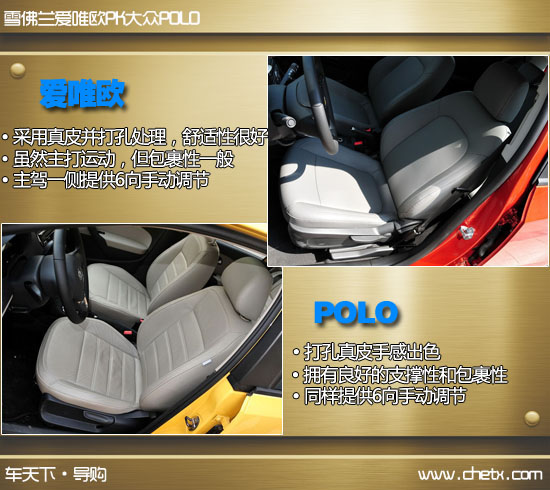 POLO是大众旗下一款经典的小型车,其获奖无数,销量显赫,目前在售的是第五代POLO。爱唯欧是基于通用全新Gamma II平台下研发的小型车。今天的题目是挑战王者的地位,那么肯定派出双方最有实力的车型,分别为两款车的最高配车型,将两款车最强大的一面展现出来。POLO的高配车型为2011款 1.6 AT致酷版,售价12.39万;爱唯欧高配车型为2011款 两厢 1.6 AT SX,售价11.18万。