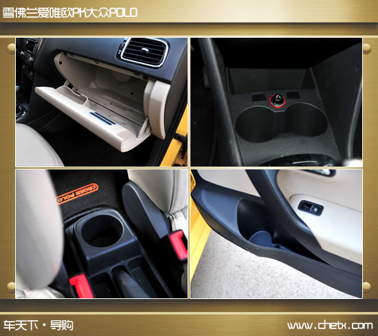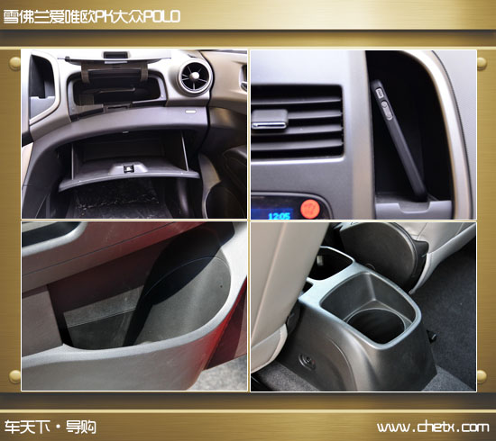 两车在储物空间上可以说实力相当,爱唯欧特别之处是中控台的多媒体区左右两侧分别设置了储物槽,在多媒体区和空调区之间设置了卡槽,副驾驶前方也设计成上下双层的储物格,而且手套箱开启时还带有阻尼,还在前车门、前排座椅中间等多处设计储物格。但是遗憾的是在后排并没有太多储物的地方,后车门也没有设计储物槽。POLO虽然在中控台两侧没有储物槽,副驾驶处也没有双层储物格,但是在POLO中控台下方有两个杯架,在后车门处设计了储物格,总体来说两车在储物上不相上下。