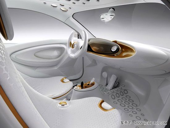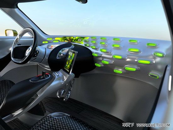 内饰方面,smart Forvision的最大特点就是采用了由超薄纤维织物组成的座椅,座椅内含有高性能海绵,通过导电层可以让座椅加热或制冷。此外,我们还可以看到这款车顶部有很多六边形孔状物,这不是为了美观,而是一块太阳能吸热板,用来吸收热能来控制车内的多媒体设备和空调。