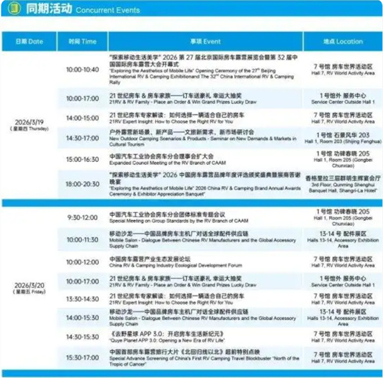敬请广大观众和行业同仁莅临参观指导,共同见证这一盛况!2026年3月19日-3月22日,第27届北京国际房车露营展览会暨第32届中国国际房车露营大会,北京·首钢国际会展中心,我们不见不散!
