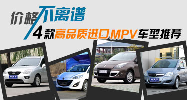 价格不离谱 4款高品质进口MPV车型推荐 车天下汽车网 发表于:2012-12-12 07:53 随着中国家庭格局的转型,对于工商两用的MPV的需求逐渐升温,但是国产MPV市场上选择不是很多,转眼到进口MPV市场,有没有一款价格实惠、高品质的MPV车型可供选择呢?下面,就随同小编一起去看看吧! -