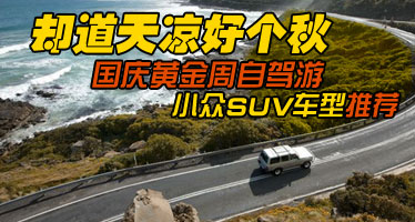 却道天凉好个秋 国庆黄金周自驾游小众SUV车型推荐 车天下汽车网 发表于:2012-09-12 07:03 国庆十一黄金周假期马上就到了,好不容易等到的长假显得弥足珍贵,快抓紧时间,和家人朋友一起驾车去游玩吧!正值告别酷暑秋高气爽的好季节,驾车漫游于大自然秀美山水之间,或是另辟蹊径去古老小镇体验民风……希望这个十一可以给你留下一段美好的自驾游回忆。 -
