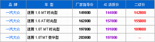 2. 4S店1.6速腾可优惠5000元,1.8T速腾可优惠6000元;二级经销商报价为优惠8000元。