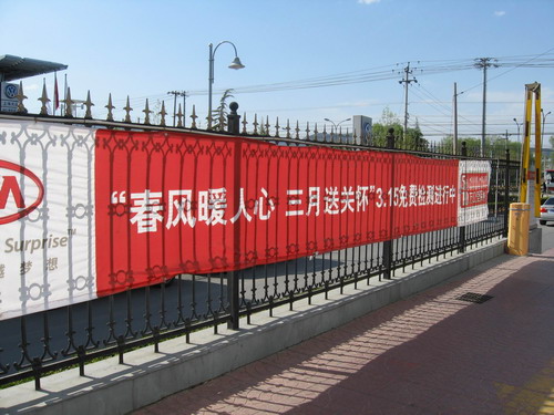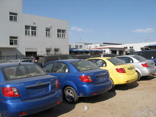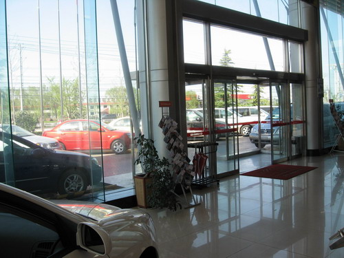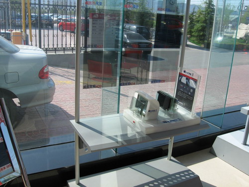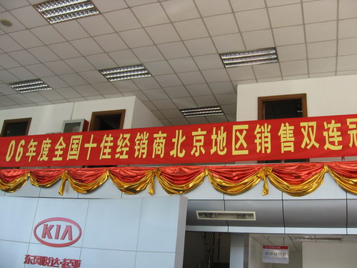 在店门口一个架子上摆放着几把雨伞,看来这是为赶上天气不好的客户准备的,设想不错,但现在却变成了摆设,整个架子上只剩下了三把雨伞。展厅内还悬挂着金佳景店荣获05、06年北京地区销量冠军的横幅,看来金佳景店销售人员众多还是有一定道理的。 ※