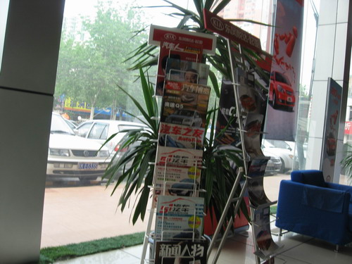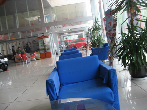 汇京嘉悦4S店布置得非常整洁和规范,有不少展板和宣传单,方便顾客了解车型资料。笔者注意到,只要是有顾客坐下休息,立即就会有工作人员端过水杯,而在顾客离去的时候,工作人员马上就开始清理桌面,并把椅子归位。在展厅和维修车间之间,有一个专门供前来维修的顾客休息的小厅,有五六位顾客坐在小厅里休息,可以看出该店对顾客如何打发时间考虑得还是非常周到。