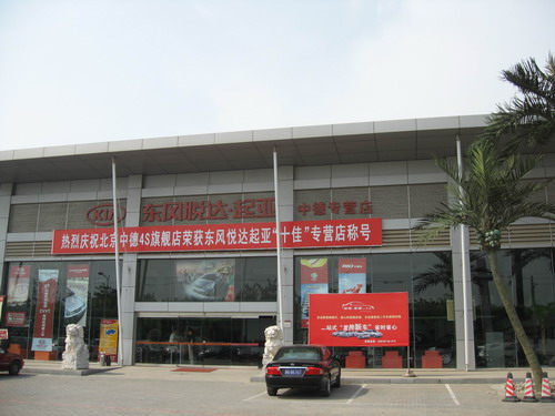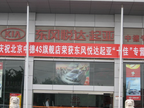 下午3点,笔者来到东风悦达起亚中德店,没进门,首先看到的是中德店获“十佳专营店”的横幅,在笔者印象中,走访过的东风悦达起亚4S店,还有1家获得过厂家类似的荣誉,如勤华瑞达店获“北京地区最佳经销商”称号。看来,中德店获得的是全国的称号,应该比勤华瑞达高一些。