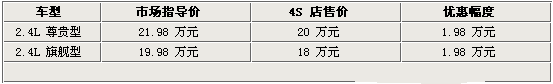 日前,东南为适应市场,加大戈蓝(报价 参数 图片 论坛)的竞争力为目的,以16.98万元(报价 参数 图片 论坛)推出了戈蓝2.4L精英型。而戈蓝的尊贵型和旗舰型在4S店也出现了大幅优惠。笔者走访北京东南汽车4S店得到消息,戈蓝全系优惠1.98万。一下为戈蓝具体车型实时价格: