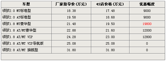 上表显示,领驭五款车型中优惠的幅度最大的为1.8T手动豪华版,这款车型除了有近2万元的现金优惠外还4S店还赠送价值3000元的大礼包,其他车型的优惠也在万元左右,而且几家经销商均表示此优惠价格是提裸车的价格。据经销商介绍1.8T VIP导航版和2.8旗舰型销量较小,价格上没有优惠,而且店内一般没有现车,消费者购买只能预定,等待时间两周左右,订金1000-3000元不等。