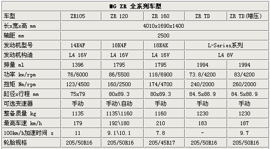 从上表中我们可以看到,MG ZR的最突出特点是相当优秀的动力性能。在这款体重1吨出头的小车上,其装备的最孱弱的1.4L发动机都具有76kW、123Nm的动力输出,这使得MG ZR的0-100km/h加速时间均11s以内。要知道同为A0级别小车的POLO(报价 参数 图片 论坛)其所装备的1.4L、1.6L发动机的动力输出分别只有55kW和77kW。这么比较下来,也许大家更能理解MG品牌对于旗下车型动力性的追求了吧。
