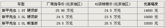 近日,新甲壳虫(报价 参数 图片 论坛)1.8T车型重出江湖,陆续在国内各个城市上市,1.8T硬顶版的售价为25.5万(报价 参数 图片 论坛)。而据记者了解,在北京地区大众汽车4S店,新甲壳虫最高优惠已接近1.5万,不仅是2.0L车型,1.8T新车更是有大幅优惠,且现车齐全。下表为新甲壳虫北京地区的优惠详情:
