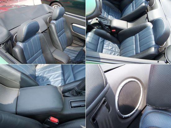 跑车式桶型为双色真皮包裹,视觉冲击力强侧面支撑力出色,能让您在极限驾驶中身体不至于左右摇晃。中养扶手也有真皮包裹,但是没有安全锁扣在敞蓬状态下很容易开启。虽然开始后车辆的报警系统会起作用,但是其中的物品却得不到安全的保护。座椅后部装有大尺寸的音响喇叭足可以让你在天气好的时候“招摇过市”。