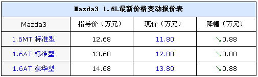 7月31日,我们从一汽马自达北京首汽腾达4S店处了解到,刚刚于7月20日上市的Mazda3 1.6L车型官方价格有所调整,三款车型最新的官方价格分别为:手动标准11.8万元(报价 参数 图片 论坛)、自动标准12.8万元、自动豪华13.8万元(之前三款车型的售价分别为12.68万元、13.68万元和14.68万元)。