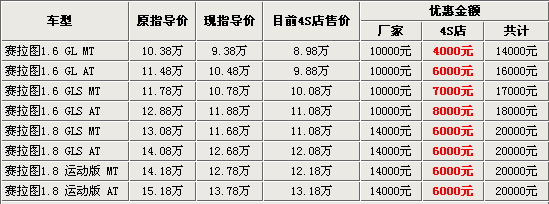 从上表我们可以看到,4S店的优惠金额在4000到8000元之间不等。赛拉图1.6手动GL在厂家和4S店优惠后,售价仅为8.98万元,已经跌到了9万以下。如此大的优惠力度,想必单凭经销商一方是难以完成的,那么厂商为什么不一次把赛拉图降到底呢?据4S内部人员透露:东风悦达起亚知所以没有公布赛拉图的售价底线,很可能是为了下半年上市的两厢赛拉图作铺垫。依照目前我国“两厢比三厢轿车便宜”的定律来看,如果三厢赛拉图的定价太低的话,将直接影响到两厢赛拉图定价。