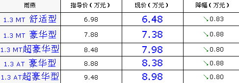 本周,雨燕(报价 参数 图片 论坛)在二级经销商处有最高8800(报价 参数 图片 论坛)的优惠,而在4S店处优惠仍保持在5000元,不过如果努力争取一下,可能会有更多的优惠,具体价格信息见下表。