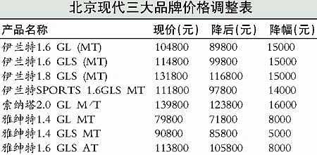“金九银十”的车市开始新一轮降价了。昨天,北京现代宣布对旗下伊兰特(报价 参数 图片 论坛)、雅绅特和索纳塔(报价 参数 图片 论坛)三大产品17款车型进行大幅降价,伊兰特三厢车价格整体下调1.5万,索纳塔车系整体下调1.6万,雅绅特车系降价幅度从5000元(报价 参数 图片 论坛)到8100元。