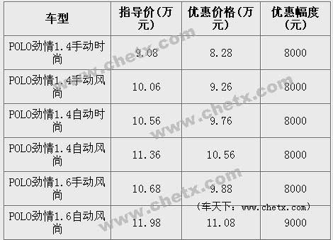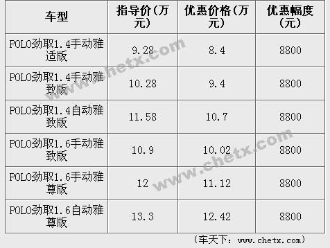 近日,在北京博瑞(报价 参数 图片 论坛)祥康汽车销售有限公司,polo劲情劲取全系列车型有九千元的价格优惠,具体价格参见下表。