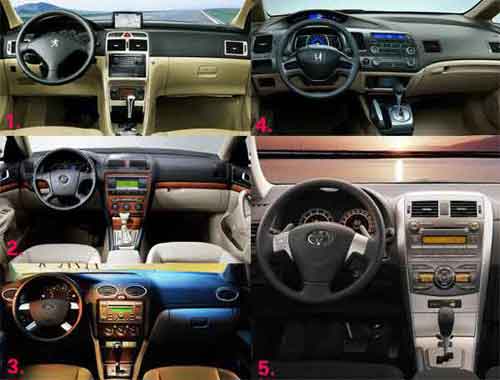 图中图1为新标致三厢307内饰;2为明锐(报价 参数 图片 论坛)内饰;3为福克斯(报价 参数 图片 论坛)内饰;4为CIVIC内饰;5为卡罗拉(报价 参数 图片 论坛)内饰