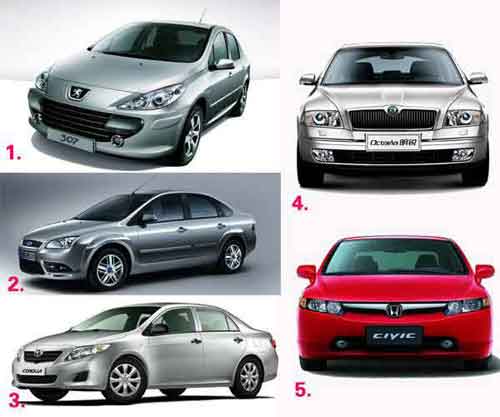 图中1为新东风标致三厢307;2为三厢福克斯(报价 参数 图片 论坛);3为卡罗拉(报价 参数 图片 论坛);4为明锐(报价 参数 图片 论坛);5为CIVIC