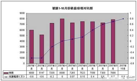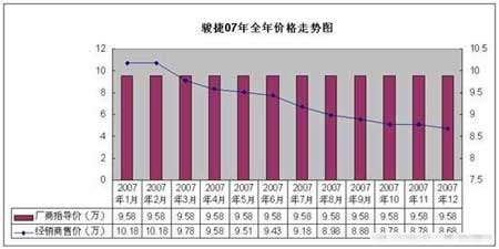 从骏捷的销量/价格走势上我们就可以看出,骏捷的销量并没有大幅变动,但是其降价优惠幅度确是非常明显的,从年初的加价6000元提现车一直到目前优惠8000元,价格上相当于下降了14000元。但是我们要注意到骏捷开始降价的点——07年5月份。5月份是个很尴尬的月份,车市也有5.1黄金周的说法,但汽车销售的真正旺季是5.1之前。所以我们可以明确地看到,骏捷在4月份销量达到8000辆的销售高峰后。此时骏捷的产能问题已经解决。但是在5月份这种尴尬的淡季,原本高傲的骏捷只好降价促销。但降价一开始,就像打开了潘多拉德盒子一样,在以后的月份里骏捷的降价幅度一直在增加,而且没有减弱的趋势。可见随着骏捷上市时间的的增长,消费者的新鲜感逐渐消失;很多新车入市,众多车型降价使原本就是靠性价比取胜的骏捷的价格优势逐渐降价,所以骏捷也是随着竞争的加剧所以优惠幅度也是一路增大。