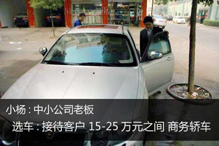 随着公司业务规模的不断扩大,其应酬来往也日益增多。小杨愈来愈感觉捷达不仅外观显现陈旧,而且空间舒适型以及品牌效应都不足以应付接待客户的需要。有客户早就对小杨半开玩笑半认真的说,“要不是多年的合作,还真不敢信任一个只是开捷达的负责人,给人感觉太像一个皮包公司”为此,小杨特地把公司搬到了本地一家最有名气地写字楼办公,同时也开始物色合适的替代车型。考虑与公司规模相称,初步价格定在25万以下。至于下限,小杨并没有一个具体原则,只要不低于15万就好。太低价格了,档次上不去,也就违背了换车的初衷。