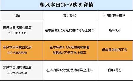 加价评论:新CR-V作为一款城市型SUV,时尚的外形和比较丰富的配置使得这款车有着不错的性价比,不过由于东风本田产能有限,CR-V的产量根本不能满足消费者的需求,于是就出现了加价提车的现象。就新款CR-V的定价而言,相比老款的CR-V车型,价格已经高出2万左右。虽然新款CR-V定价还算贴近民意,但加价3万则绝对是绝对不能让人接受的。毕竟这样的城市SUV车型,加价的3—5万元(报价 参数 图片 论坛)已经远远超出了车型本身的价值。如果定要如此加价,那么消费者完全能选择其他品牌的SUV车型或是中高级轿车,我劝消费者不要在一棵树上吊死,毕竟现在车市上的车型非常多,可供选择的车型也很多。不过我们得到一个很好的消息,东风本田的新厂已经基本能够投入生产,我想明年CR-V可能将不再会受到产能的影响,从而也使得加价提车的现象成为历史。