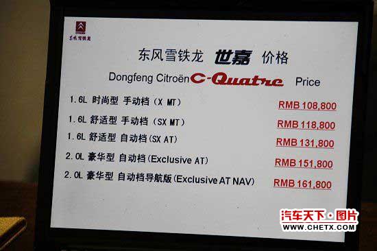 7月28日,正式公布了高品质两厢车——世嘉(报价 参数 图片 论坛)(C-QUATRE)的市场售价,其价格区间为10.88-16.18万元(报价 参数 图片 论坛)。世嘉共有5款车型,其中1.6L车型3款,2.0L车型2款,其具体价格分别为1.6手动时尚型X MT 10.88万元 1.6手动舒适型 SX MT 11.88万元 1.6自动舒适型 SX AT 13.18万元 2.0自动豪华型 Exclusive AT 15.18万元 2.0自动豪华型导航版 Exclusive AT NAV 16.18万元。