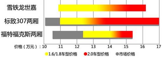 相对于标致307两厢,两厢车型正可谓是世嘉的正面竞争对手,两者都是WRC赛车的原型车、都为5门掀背造型、都定位运动型两厢车,而从价格上看,世嘉的价格区间要比两厢福克斯(报价 参数 图片 论坛)宽泛很多。此外,由于入门级两厢福克斯为1.8L车型,所以低端车型的价格要相对1.6的世嘉更高一些。