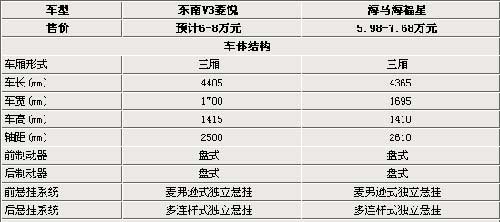 7月末,海马汽车的海福星(报价 参数 图片 论坛)系列推出了幸福版车型,将该系列的价格区间拉下到6万元(报价 参数 图片 论坛)以内。而同样地处南方的福建东南汽车也将在下半年推出V3菱悦(报价 参数 图片 论坛)自主研发车型,并且这款车将在本月月底正式下线。相信有很多人对东南汽车和海马汽车都有了简单的了解,这两个汽车品牌都与国外汽车品牌有过深度合作。目前东南和海马都在自主研发的道路积极进取,很多新产品也就顺应而生。而即将上市的东南V3菱悦与海马海福星究竟如何,两款车各有哪些优势,我们将随着以下的介绍来详细了解。