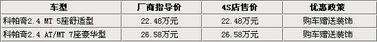 据4S店销售人员透露,目前购买雪佛兰科帕奇车型无加价现象。在价格方面,虽然不能有现金优惠,但与之前相比已有了车内装饰的赠送。从货源来看,虽有所好转但也不是很乐观,目前5座舒适型的现车比较少,颜色并不齐全,如果预定需要等2周左右。