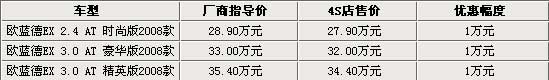 据三菱汽车北京地区4S店销售人员介绍,欧蓝德EX目前现车比较齐全,全系均可以优惠现金一万元,如果到店详谈还可能有更多的优惠政策。目前欧蓝德2.4L舒适两驱车型北京无车,暂时不能接受预定。