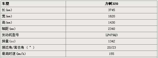 力帆320是力帆汽车开发的首款两厢微轿,主要是针对目前年轻消费群体进行研发设计。不难看出,力帆320的车身造型借鉴并融入经典车型mini cooper的设计元素。力帆320为五门掀背版紧凑型轿车,长宽高分别为3755mm、1624mm和1435mm,最小离地间隙为135mm,具有良好的通过性能。2340mm的轴距让其在AO级车型中拥有无可比拟的空间优势。