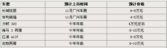 时下,人们常用“精品小车”来形容两厢紧凑型车,这些两厢小车多给人以或时尚、或灵动的感受。正是这些时尚灵动的两厢小车,在中国汽车市场中所扮演的角色比重也在日渐升级。因此,即将上市的两厢车也都集中在10万以内的价格区间中,更贵一些的车型还是以三厢为主。继F0之后即将上市两厢车为长城炫丽(报价 参数 图片 论坛),将于10月6日下线,预计售价在6-8万之间。
