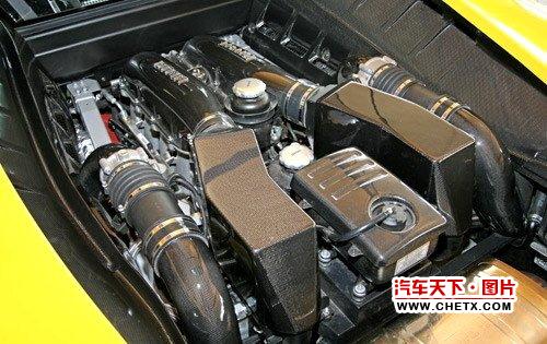 第一眼的震撼来自于驾驶员后面的发动机,当然,原来的V8发动机已经很让人震撼,原先的鲜红色变为了黑色,大量的碳纤维套件的应用看起来更像是一款随时准备下赛场的赛车。黑色的水冷中冷器帮助保持送进发动机体内空气的温度。