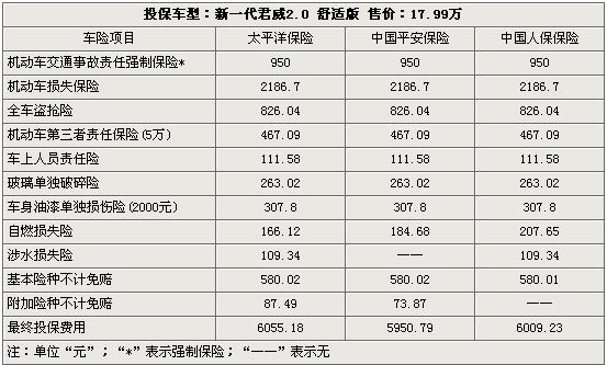 出自上海通用Epsilon II平台的新一代君威(报价 参数 图片 论坛)已于本月初正式上市,其搭载2.0与2.4排量发动机的四款车型售价为17.99万-24.59万。那么在购买新一代君威车型后,其保险又将如何选择呢?下面我们将北京地区太平洋、平安、中保三家保险公司对新一代君威入门车型的投保费用进行详实解析,以便为您购车提供一定的参考。