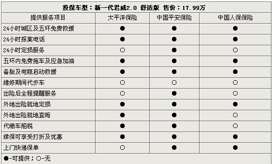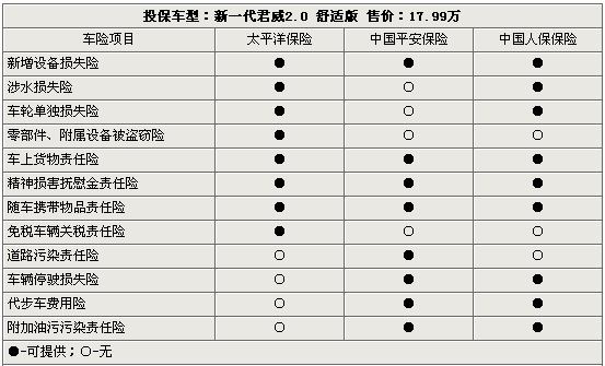在太平洋、平安、中保等三家保险公司的保险项目里,机动车交通事故责任强制保险是一项强制保险项目,并且价格统一为950元(报价 参数 图片 论坛)整。除此之外,三家保险公司的车险项目基本保持一致,但相应的费率存在一定的浮动,其中太平洋保险的报价最低,中国人保保险的报价最高。另外,在机动车第三者责任险中,消费者除了可以选取5万保险额外,还可以选择10万、15万、20万元保额等。而在车身油漆单独损伤险(常说的划痕险)方面,消费者也可以选取更高的保额如5000元、10000元不等。由于新车在第一年里属于汽车厂商的保修范围之内,所以自燃损失险可以不上。值得一提的是“不计免赔”这个险种,购买这个险种的最终的是消费者出险后保险公司可以百分之百的赔偿,反之则只能按照比例部分赔偿。