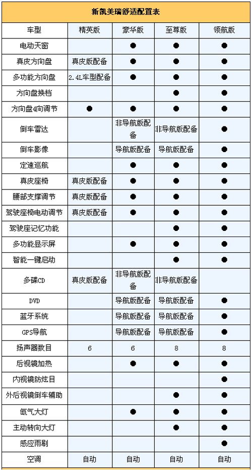 豪华版属于整个车系的中坚车型,在精英版基础上新增加了电动天窗、倒车雷达(导航版车型为倒车影像)、多功能方向盘、氙气大灯,多功能显示屏,这是目前中高级车型的主流配备,对于绝大多数用户来说这些配备完全足够,值得推荐。至尊版在豪华版基础上增加了驾驶座椅记忆功能、主动转向大灯和一键启动功能,舒适享受性明显提高。值得注意的是这两个级别车型的导航版相比非导航版,除了多导航功能外,蓝牙、倒车影像以及DVD也是重要的差别,原因是导航版有中控液晶显示屏,这些功能都是需要它来支持的。喜欢这些功能的用户,导航版优先值得推荐!