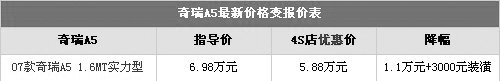 奇瑞A5可以算得上是自主品牌实惠车型的代表车型,6万元(报价 参数 图片 论坛)左右的价格、三厢车型空间、1.6L排量发动机、真皮座椅、电动天窗,真的是应有竟有。所以第一个推荐的实惠自主品牌车型就是奇瑞A5,但是奇瑞A5还需要继续努力,几年都一成不变,竞争力渐渐没有优势,这里编者期待奇瑞A5的改款车型。以下是奇瑞A5报价表: